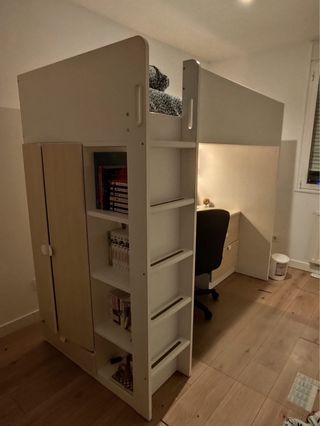 Litera funcional que combina cama, escritorio y armario. - Estructura principal en color blanco. - Armario con puertas en tono madera clara. - Estanterías integradas para almacenamiento.