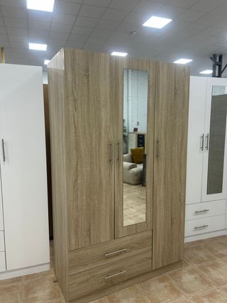 ☎️ 680*558*196 Se vende armario ropero de 3 puertas totalmente NUEVO, en acabado color roble, ideal para dormitorio moderno. Diseño elegante con espejo central y gran capacidad de almacenaje. ✨ Características: ✅ Armario de 3 puertas amplio y funcional ✅ Espejo central de cuerpo completo ✅ Incluye 2 cajones inferiores ✅ Interior espacioso para ropa, perchas y organización ✅ Color roble moderno, combina con todo ✅ Material resistente y fácil de limpiar 📏 Medidas: ALTO: 200 cm ANCHO: 120 cm FONDO : 52 cm 🎯 Ideal para: Dormitorios, habitaciones juveniles, pisos, apartamentos o alquiler (Airbnb