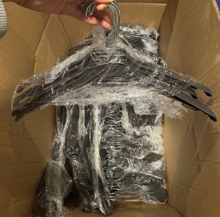Lote de 400 perchas de plástico en color negro acolchadas hombreras de terciopelo. - Diseño resistente y duradero. - Ideales para organizar tu armario. Estan organizadas en lotes de 6 perchas en bolsas. 40 cm de ancho. Se vende el lote entero o en cantidades menores.