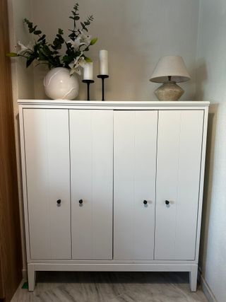 Armario modular de la serie PAX de Ikea. Sus puertas blancas y tiradores de Zara Home le dan un toque elegante. - Diseño de puertas paneladas. - Tiradores metálicos de Zara Home. Los módulos se venden también por separado.