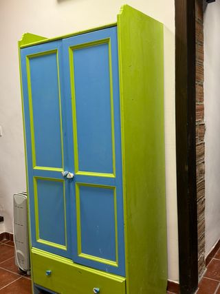 Armario de madera con un diseño colorido y funcional. El armario es de madera maciza, en buenas condiciones. Como se ve en la foto, la parte de arriba no tiene parte trasera, es para apoyar contra una pared, o agregar trasera. - Puertas abatibles. - Estantes interiores. - Cajón inferior con tiradores.