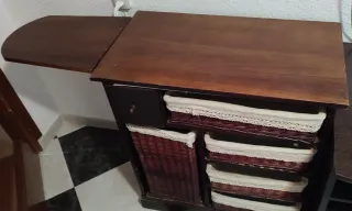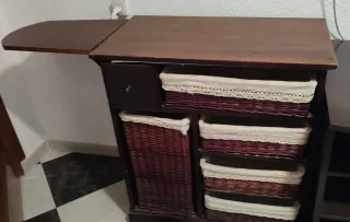 Mueble auxiliar con un diseño práctico y elegante. - Estructura principal de madera. - Cestas de mimbre integradas para almacenamiento. - Acabado en tonos marrones y beige. - El mueble dispone de un sistema abatible que permite su transformación en una tabla de planchado.