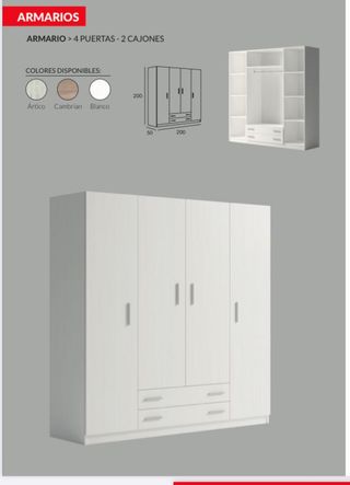 Armario de 4 puertas en color cambria. - Disponible en 5 colores: ártico, cambrian, cerezo, blanco y wengue - Dispone de 4 puertas amplias. - Incluye 4 cajones en la parte inferior. - Perfecto para organizar la ropa. - compartimento superior - Medidas: 200 x 197 x 51 cm