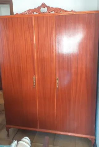 Armario antiguo de madera con un diseño clásico y elegante. - Tres puertas con tiradores dorados. - Detalles ornamentales en la parte superior. - Patas talladas. -LO DESARME HACE POCO ,piezas completas. vale