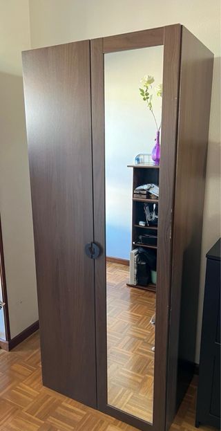 Armario de dos puertas con un espejo en una de ellas. Disone de una barra para perchero y una balda. Tiene unas pequeñas marcas como se ve en la foto. - Acabado en madera oscura. - Puerta con espejo de cuerpo entero.