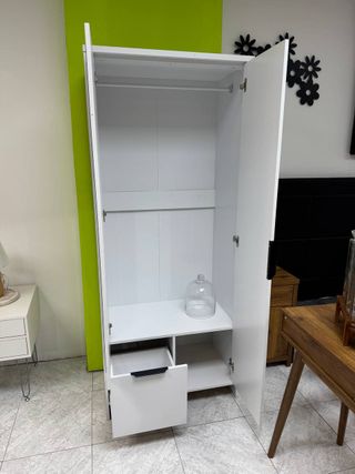 NUEVO Armario de 2 puertas con espejo en la puerta pequeña y un cajón debajo de la misma puerta Con barra para colgar Fabricado en melamina Disponible en color blanco y Cambria Medida Alto: 190 cm Largo: 80 cm Ancho: 50 cm Ofrecemos entrega Pago contrareembolso