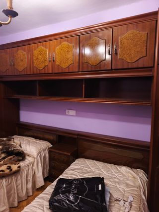 Armario tipo puente con dos camas. Las camas son de 90x182, la mesita de 40 y los armarios laterales de 62 ancho y 50 de fondo. Esta en buen estado. Tiene cómoda y espejo a juego