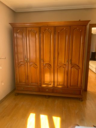 Armario de madera de castaño completa con un diseño clásico y elegante. Situado en Llanera. En perfectas condiciones , apenas uso. - Seis puertas. - Tiradores dorados. - Cajones inferiores.