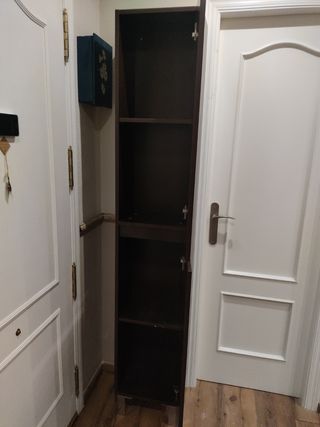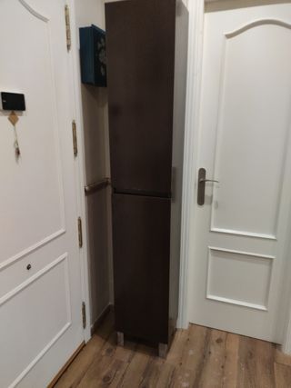 Mueble de baño alto en color marrón oscuro. Está en muy buen estado, tiene un pequeño arañazo en la puerta como se ve en la foto , por lo demás perfecto Medidas: 195 cm alto 35 cm ancho 27 cm fondo - Dos puertas. - Tres baldas interiores. - Perfecto para guardar productos de aseo.