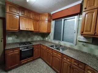 Conjunto de muebles de cocina con acabados en madera y detalles en piedra. - Diseño de cocina en L. - Encimera de piedra. - Armarios de madera. - Horno y encimera no incluidos HAY QUE DESMONTARLA. Está en una planta baja, a pie de calle.