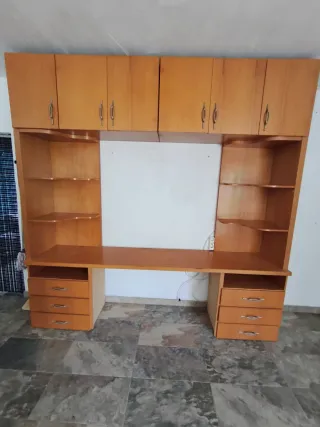 Si te los llevas todos 600€ Por separado: -Mueble grande con cajones y estantes y el armario de al lado: 250€ - Cada mesa(son 5 y algunas son dobles que se venden como una unidad y todas valen lo mismo): 80€ -Mesa redonda: 50€ -Pequeño mueble con lejas: 30€ Conjunto de muebles de oficina con diferentes módulos. - Módulos de almacenamiento con puertas. - Cajoneras de distintos tamaños. - Estanterías abiertas.