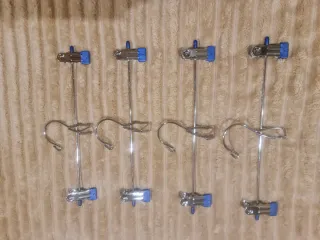 Conjunto de cuatro perchas diseñadas para colgar prendas con pinzas. Son prácticas para organizar ropa. - Construcción metálica y detalles en plástico. - Pinzas seguras para sujetar la ropa. - Cada percha tiene un gancho y ahorra espacio en el armario.