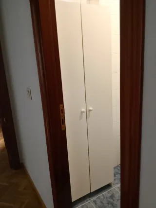 Armario blanco de dos puertas con tiradores redondos. Las baldas son desmontables como se ve en las fotos Tiene un pequeño descorchón en la parte interna de la zona inferior derecha, aparte de eso está bien conservado. Preguntar sin compromiso. 180 x 51 x 54 (Fondo)