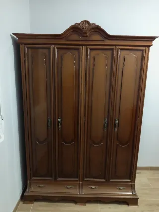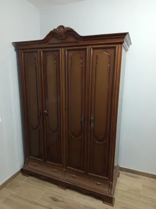 Armario antiguo con un diseño clásico y elegante. Sus acabados en madera le dan un toque cálido y atemporal a cualquier habitación. - Tres puertas frontales. - Tiradores metálicos. - Amplio espacio interior.medidas ancho 2 metros alto 2 metros recoger en ciudad rodrigo