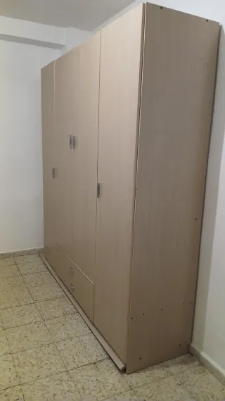 Conjunto de muebles de dormitorio con armario y camas plegables. Cuatro de los modulos son dividibles en modulos de 1 metro. Tiene otro de 49 cm y otro de unos 20 cm. Puede amueblar dos hsbitaciones. Se compone de 2 camas con colchones. 2 armarios de 90 y y uno de 45. Mesa de estudo y modulo de 20 cm - Armario de madera con múltiples compartimentos. - Camas plegables integradas para optimizar espacio. - Diseño funcional y moderno.