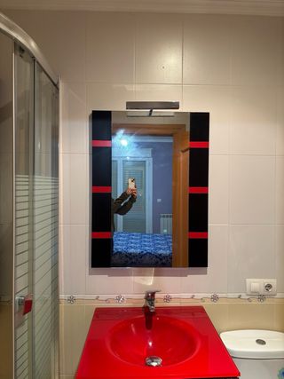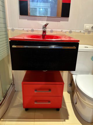 Vendo mueble de baño en buen estado, ideal para darle un toque moderno y práctico a tu baño. Cuenta con buen espacio de almacenamiento para guardar productos de higiene, toallas u otros accesorios. Incluyo espejo de regalo, perfecto para combinar con el mueble y tener el conjunto completo. Se vende por cambio de decoración. Listo para recoger y usar. Medidas Mueble marron + lavabo (55 ancho x 27 alto x 51 fondo) Mueble rojo ruedas (47 ancho x 39 fondo x 42 alto) Espejo (60 ancho x 80 alto)