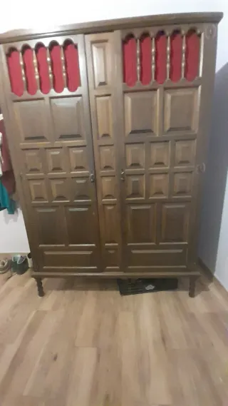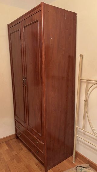 Armario de madera con un acabado oscuro y elegante. - Diseño clásico con detalles decorativos en los marcos de las puertas. - Tiradores integrados en el diseño. - Dos puertas amplias para un gran almacenamiento. Recogida en persona en salamanca Precio negociable, urge venta Es un cuarto piso sin ascensor