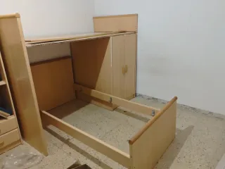 Conjunto de muebles juveniles que incluye dos camas y un armario. - Cama a doble altura con estructura de madera. - Armario grande con puertas. - Se incluye somieres