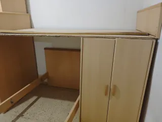 Mueble versátil que combina cama nido, mesa, cajones y armarios. - Estructura principal en tono madera. - Cajones frontales en color verde. - Tiradores de madera. Cama nido de 90 con una mesa extraible con railes, dos cajones debajo y dos armarios a los laterales. Abajo otra cama de 90 extraible. No tengo mas fotos porque la cama ya está desmontada y guardada. Está en perfecto estado. El unico desperfecto que tiene es unos descascarillos en los tornillos que se hicieron al desmontar, ya que traia unos tornillos para unir los cabezales que no salian. Colchones si los quieres los tengo aparte, como nuevos. Cualquier duda preguntar.
