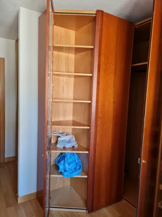 Armario de esquina con un diseño moderno y funcional. - Acabado en madera de alta calidad. - Puertas con paneles de cristal translúcido. - Tiene desperfectos el armario. - Somier 135cm - Dos colchones 105cm RECOGER EN CASTELLANOS DE MORISCOS