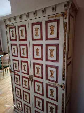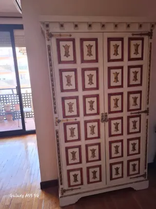 Armario de madera con un diseño clásico y elegante. Sus puertas presentan un patrón decorativo con detalles dorados sobre fondo blanco y marcos en tono burdeos. Esta en Terrassa. - Puertas con paneles decorados. - Tiradores metálicos dorados. - Molduras decorativas en la parte superior y base.