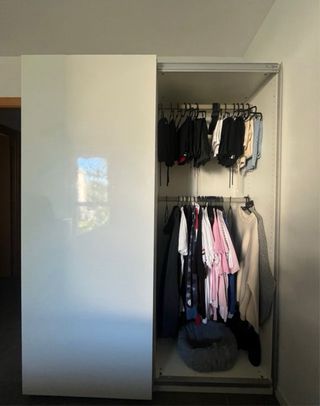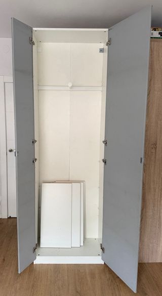 Armario PAX de IKEA en color blanco, con unas medidas de 230 cm de alto y 50 cm de ancho. Ideal para organizar tu ropa y accesorios. Se vende montado o si se prefiere desmontado. Tienes 1 balda y 2 barras de colgar.