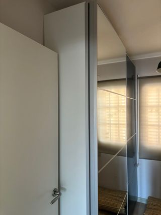 Armario de Ikea con puertas de espejo. - Acabado en blanco y plata. - Materiales de cristal y madera. - Medidas: Alto 236 cm Ancho 74 cm Fondo 37,5 cm Puerta Espejo Grande 49,5 Puerta Espejo Pequeña 24,5 SE ENTREGA MONTADO HAY QUE VENIR A BUSCARLO