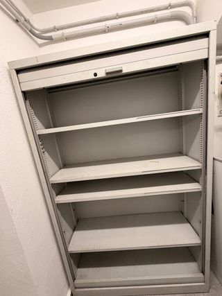 Armario de oficina/almacén en metal con cierre de persiana enrollable y estanterías interiores regulables en altura. Muy robusto y funcional para archivo, herramientas o material de trabajo. Estado: usado, con marcas normales de uso pero totalmente funcional. Incluye varias baldas interiores. Color gris claro. Medidas aproximadas: – Alto: 195 cm – Ancho: 120 cm – Fondo: 45 cm Precio: 120 € por unidad (no negociable) Ubicación: Sant Cugat del Vallès Recogida en persona. No se realizan envíos. Hay 2 unidades disponibles.