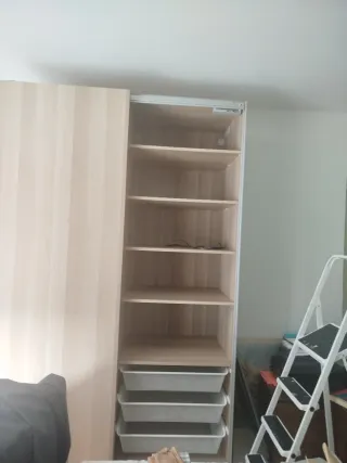 Armario de dos puertas correderas de la serie Pax de Ikea. Su diseño moderno y funcional se adapta a cualquier habitación. - Acabado en madera natural - Armario de dos puertas correderas - Múltiples compartimientos y cajones para almacenamiento - Cajones correderos de madera en el lado izquierdo y de reja a la derecha. - Estructura robusta y duradera. - Baldas y cajones incluidos. Se vende ya desmontado. Se vende por traslado.
