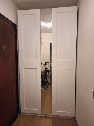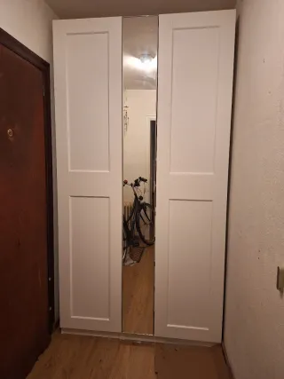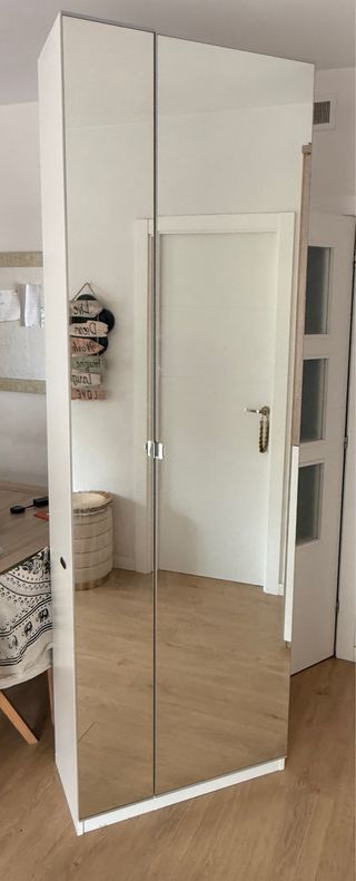 Armario de Ikea con puertas blancas y un espejo central. PAX - Diseño moderno y funcional. - Acabado en color blanco. - Incorpora un espejo de cuerpo entero. - Diversos estantes y cajones. - 2 módulos, uno de 50 cm y el otro de 75cm.
