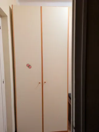 Armario de dos puertas con un diseño moderno y elegante. - Exterior abedul - Puertas en acabado blanco. - Tiradores metálicos. - Estructura de madera. - Poco uso - Medidas: ancho 81 cm x fondo 52 cm x alto 189 ( son medidas exterior) -Se entrega desmontado.