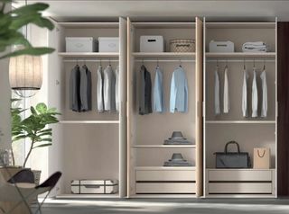 Armario a medida con un diseño moderno y funcional. - Acabado en blanco y beige. - Fabricado en madera de alta calidad.