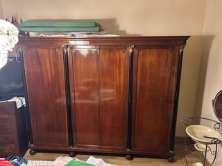 Este es un armario antiguo de caoba con detalles dorados. - Fabricado en madera de caoba. - Acabados en dorado. 3 compartimentos, con espejos interiores,