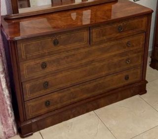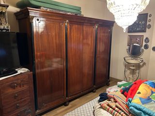 Armario de madera con detalles de espejo con cuatro puertas centrales de espejo y una a cada lateral. - Diseño clásico y elegante. - Acabado en tonos marrones. - Cajoneras interior Armario ya desmontado listo para recoger en Cantillana.