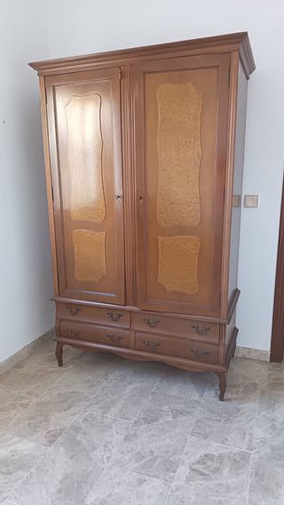 Armario de madera con un diseño clásico y elegante. - Acabado en tono marrón cálido. - Puertas con detalles ornamentales. - Tiradores metálicos.