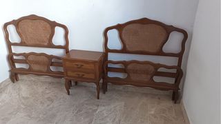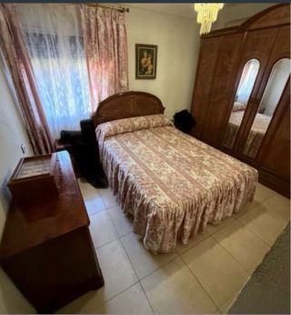 Armario de dormitorio con puertas correderas y acabado en madera. - Puerta con espejo. - Diseño moderno y funcional. - 2 Mesitas de noche medidas 45 ancho x41 fondo x 60 alto - Cabecero 2'33 ancho x1'20 alto