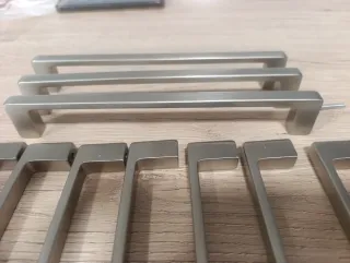 Lote de 10 tiradores de metal, de 192 mm, para muebles de cocina o armario. Su diseño moderno y acabado en color plata los hace versátiles. Incluidos todos los tornillos - Material: Metal. - Color: Plata. - Diseño: Recto con base cuadrada.