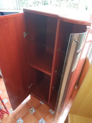 Armario antiguo de madera con un diseño clásico y elegante. Cuenta con un espejo en una de sus puertas y varios compartimentos interiores. - Puerta con espejo. - Compartimentos interiores para almacenamiento.