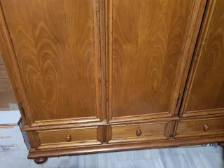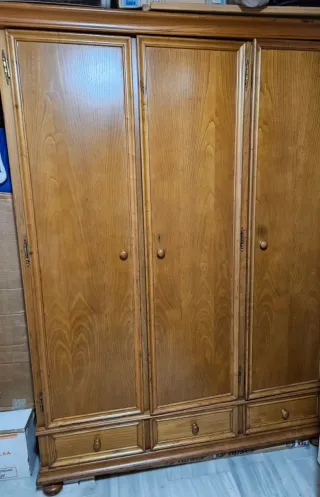 Armario ropero de madera con tres puertas y cajones inferiores. - Diseño clásico y elegante. - Tiradores redondos. - Acabado natural de la madera. Problemas (reparables) en el cierre. Medidas (aprox.): Ancho (frente): 145 cm. Alto: 197 cm. Fondo: 59 cm.