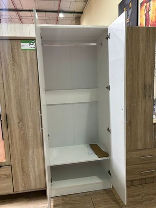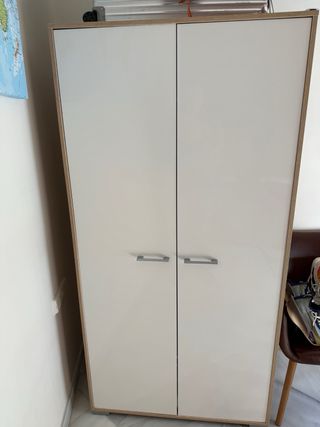 Armario de dos puertas con un diseño moderno y funcional. Cuenta con dos cajones inferiores para almacenamiento adicional. Con sólo 2 meses de uso - Acabado en madera clara. - Tiradores blancos. - Diseño de dos puertas batientes.