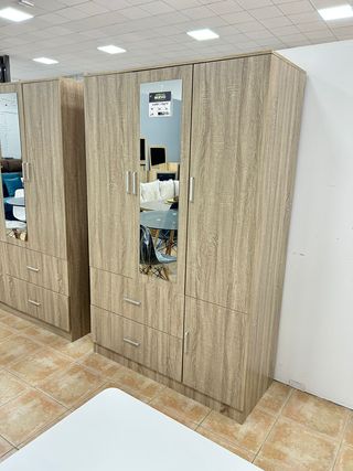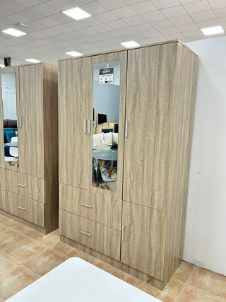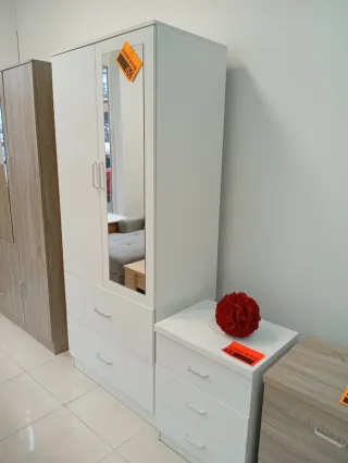 Armario, tres puertas y una puerta adicional pequeña Dos cajones Espejo Tres estantes Colgador de ropa MEDIDAS 120 × 50 × 190 de alto Disponible en color Cambria en blanco * ENVIOS A DOMICILIO (mirar zonas) * SERVICIO DE MONTAJE (consultar) * GARANTIA 24 MESES MEDIDA ARMARIO 2 PUERTAS 130€ -alto 190cm x ancho 80cm x fondo 50cm MEDIDA 3 PUERTAS 195€ -alto 190cm x ancho 120cm x fondo 50cm MEDIDA ARMARIO 4 PUERTAS 260€ -alto 190cm x ancho 160cm x fondo 50cm *ATENDEMOS WHATSAPP 673.033.132*