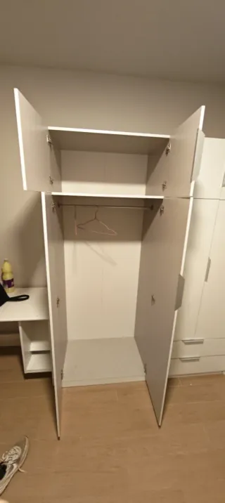 Vendo DOS Armarios de la serie PAX de Ikea como el de la foo . Un mueble funcional y espacioso para organizar tu ropa y accesorios. - Diseño de puertas batientes. - Acabado en color blanco. - Fabricado en madera. - medidas 100x60x236 - precio por uno 90 eur , por dos descuento y se quedan por 160. Uno de ellos tiene en uno de los lados un pequeño agujerito que se hizo para unirlos entre ellos -las puertas por dentro tienen roce
