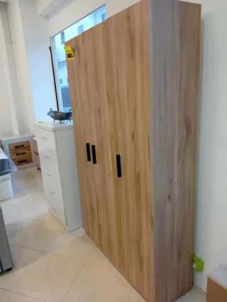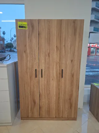 Armario de tres puertas con un diseño moderno y funcional. Ideal para organizar tu espacio. 108 X 35 X 180 - Acabado en tonos madera natural. - Amplio espacio interior con baldas. - Si quieres te lo llevamos a casa y lo montamos