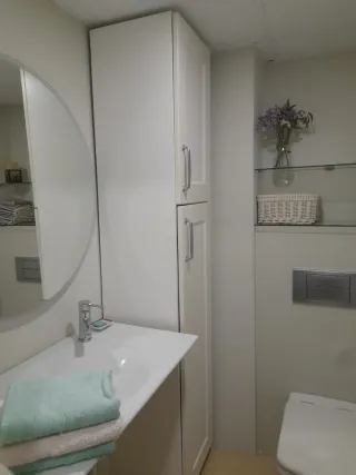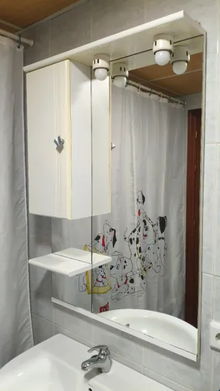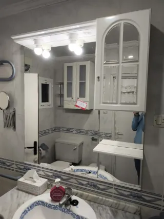 Práctico espejo con armario para organizar tu baño. Incluye estantes para mayor capacidad. En muy buen estado e incluye bombillas de led. Recogida en Cerro del Águila y se podría entregar en su domicilio por 10€ en Sevilla. - Diseño moderno y funcional. - Acabado en blanco.