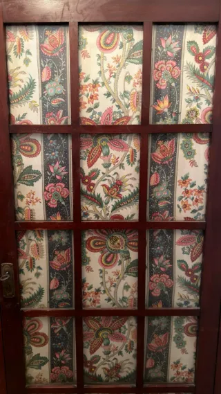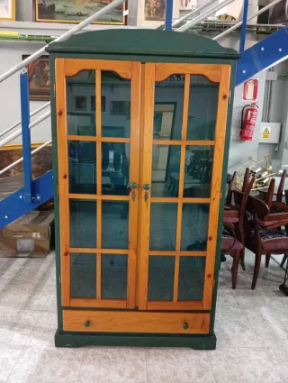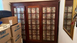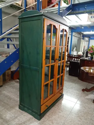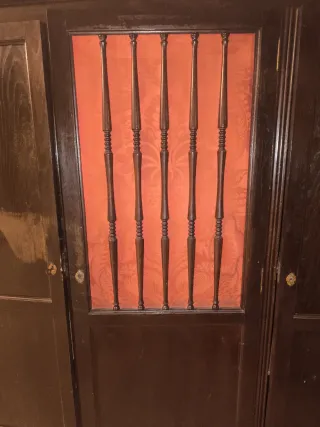 Armario de madera con tres puertas y detalles de tela. Ojo: Es necesario desmontar para transportar. - Puertas con divisiones de cristal. - Incluye llave para el cierre. Tiene visibles signos de vejez, marcas, etc como se aprecia en fotos.