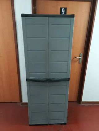 Armario de plástico con un diseño moderno y funcional. Ideal para organizar tus pertenencias. - Dos secciones de almacenamiento. - Puertas con tiradores integrados. - Base estable.