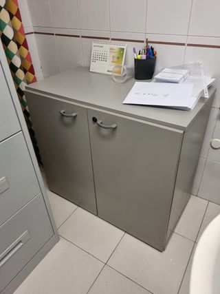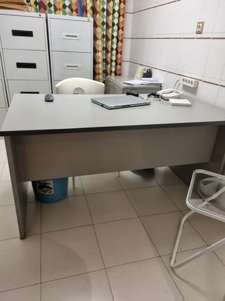 Conjunto de mobiliario de oficina en color gris. - Mesa de despacho espaciosa con dos cajones con llave 140x80x63 - Armario con llave y baldas 80x43x70