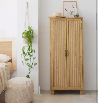 Armario de madera con un diseño elegante. - Puertas con marcos decorativos. - Tiradores metálicos. - Acabado en tono bambú