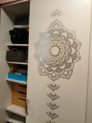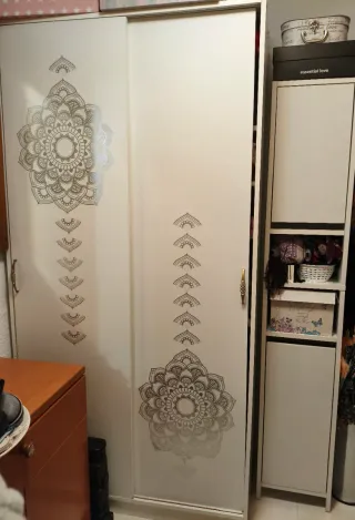Armario con puertas correderas y un diseño moderno con mandalas. - Diseño decorativo de mandalas plateadas. - Tiradores no incluidos Cuatro baldas que pueden verse en la última foto. Las baldas van de un lado a otro. Es mejor no desmontarlo. Cabe por la puerta y hay ascensor. Hay que recogerlo con furgoneta o coche grande ya que tiene dos metros de alto y un metro de ancho. Profundidad 50 centímetros.