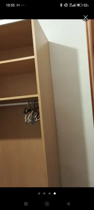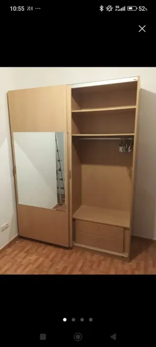 Armario amplio y resistente. Estructura en madera clara con 4 puertas abatibles de cristal translúcido tipo esmerilado y tiradores metálicos. 📦 Distribución interior: -Dos módulos independientes -Cada módulo con barra para colgar ropa -Estante superior en ambos módulos -Un módulo incluye dos cajones interiores El armario está en buen estado y es totalmente funcional. Presenta pequeños detalles estéticos en algunas zonas del cristal (desgaste de pintura), únicamente visuales, no afectan al uso. 📍 Recogida en mano. ⚠️El comprador debe encargarse del desmontaje. 💬 Precio negociable dentro de lo razonable.